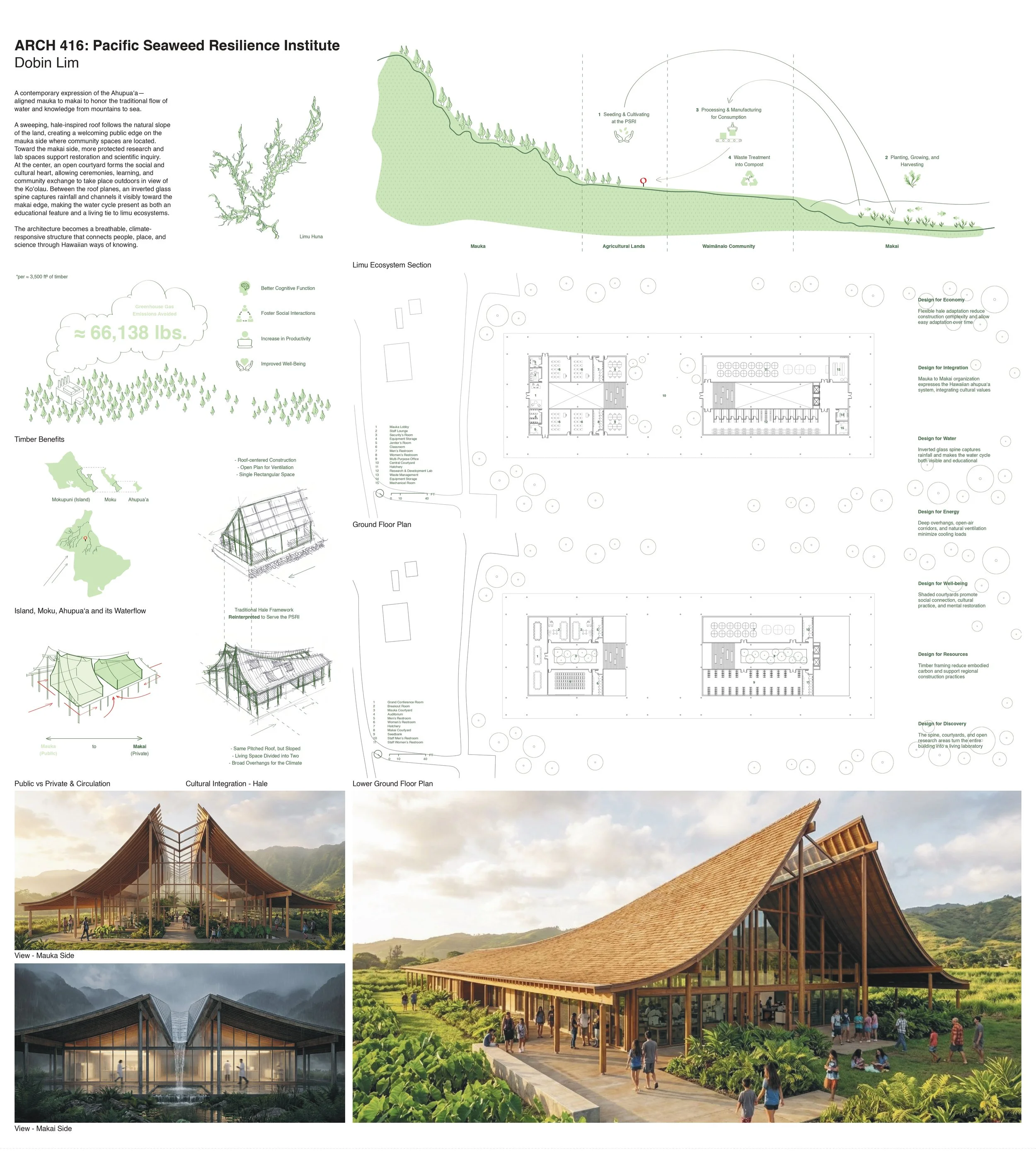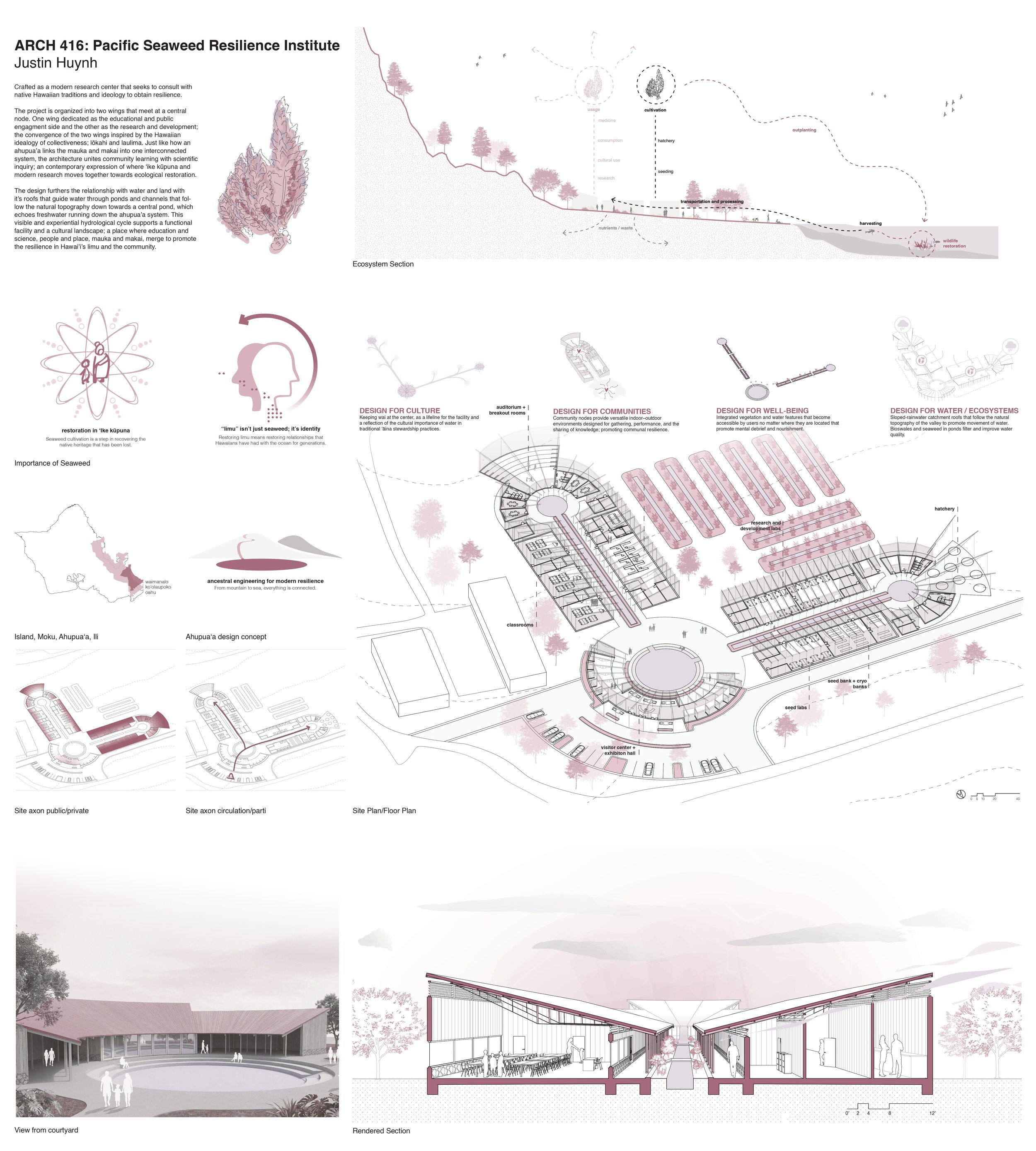 The Department of Agriculture and Biosecurity (DAB) is interested in developing ideas for a Pacific Seaweed Resilience Institute (PSRI) to house advanced seaweed genomics research and seedbanking facilities, integrate Hawaiian and Pacific Islander stewardship practices, support regional collaboration and exchange, demonstrate climate adaptive design strategies, and foster community engagement and education. DAB is partnering with the University of Hawai’i Community Design Center (UHCDC) and the UHM School of Architecture to provide students with opportunities to align their learning with these project goals.