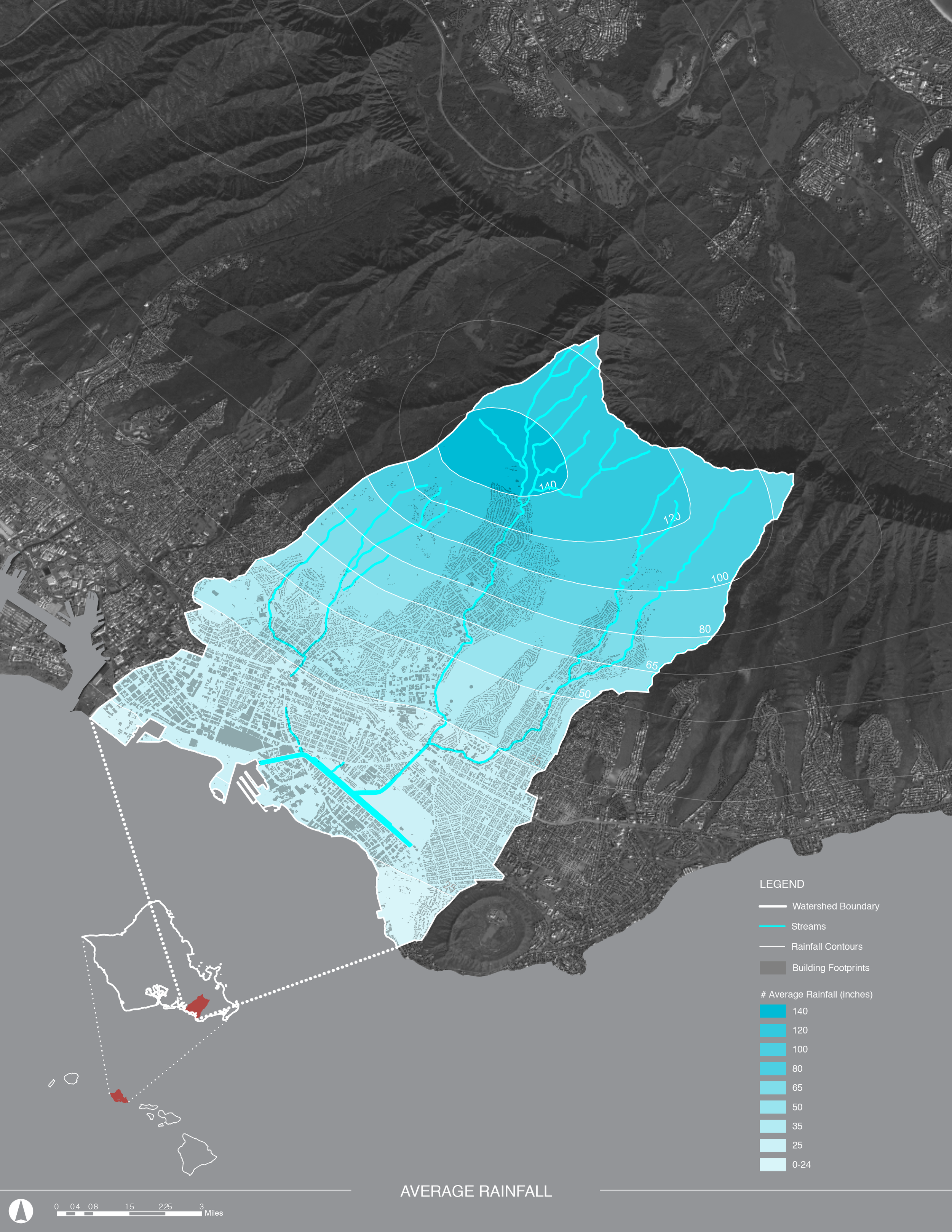 In support of the goals of the Ala Wai Watershed Collaboration, and in partnership with the Institute for Sustainability and Resilience, UHCDC produced a series of maps of the Ala Wai Watershed that compile a range of data from average annual rainfall, electoral districts, sea-level rise, to stream care and restoration. These aim at establishing a baseline of information to share with stakeholders and the public. Information was taken directly from GIS and data provided by AWWC.